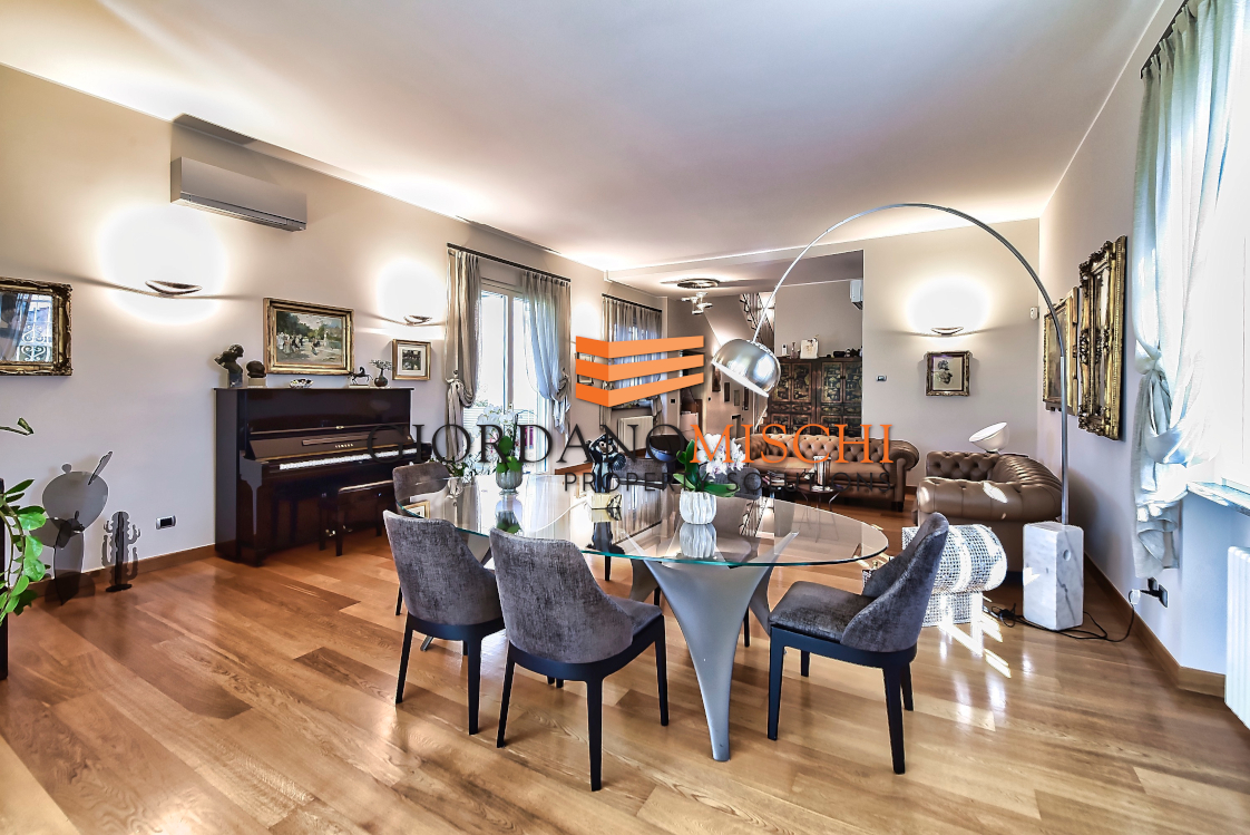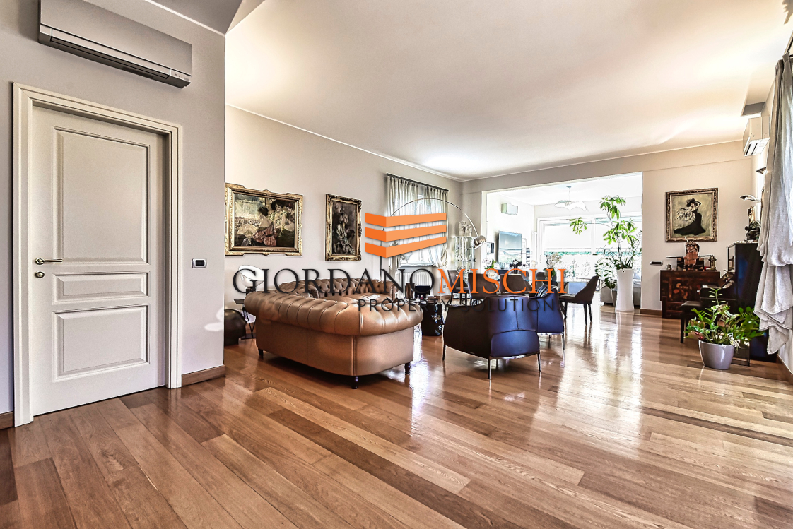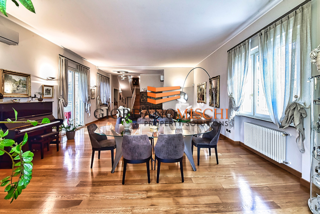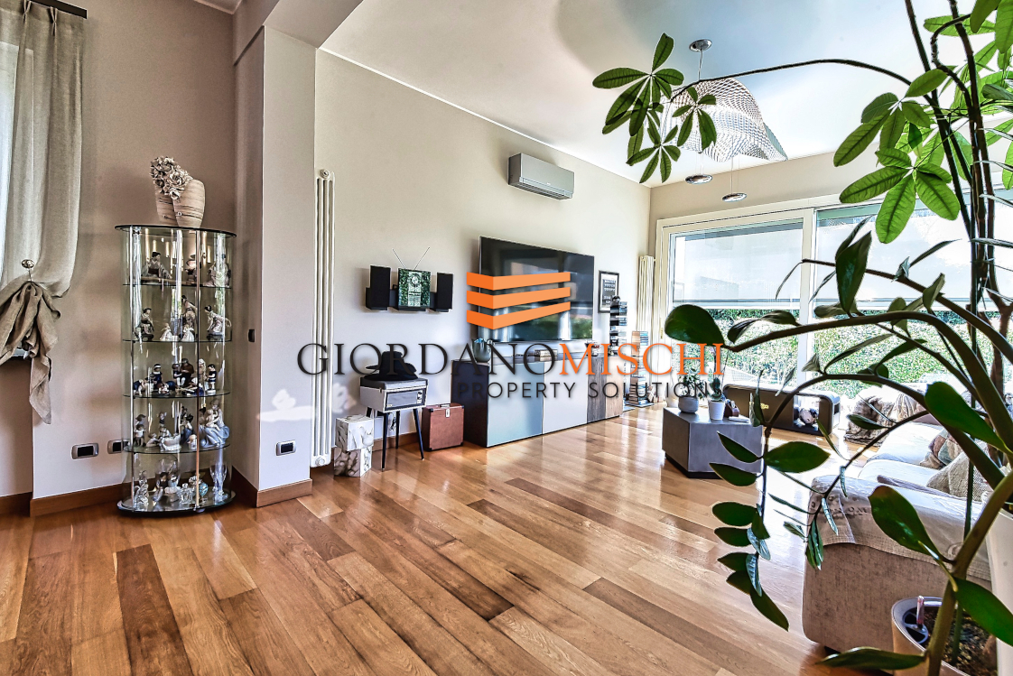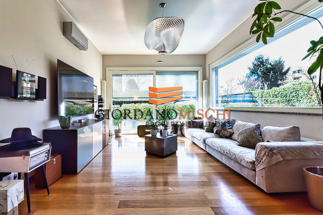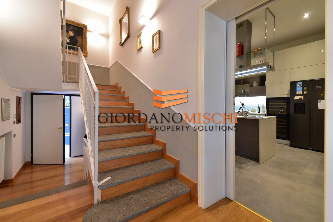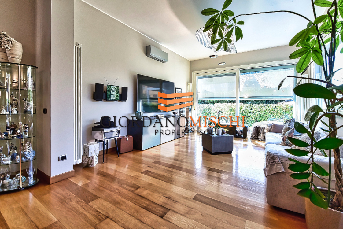 L’ingresso introduce direttamente in un grande salone doppio di straordinaria luminosità, dove la luce del giorno si diffonde generosa attraverso ampie vetrate che inquadrano il verde del parco come fossero dipinti viventi. Lo spazio si articola con naturalezza in zona pranzo e zona living, creando quella continuità scenografica che solo i soffitti alti — ben 330 centimetri — sanno garantire. La grande cucina abitabile, separata e autonoma, è pensata per chi vive la cucina come momento conviviale oltre che gastronomico, un’altra stanza dal carattere versatile, oggi destinata a zona televisiva ma assolutamente adatta a vera e propria camera o a ufficio/smart working ,si apre sul giardino con vetrate panoramiche che portano il paesaggio dentro casa in ogni stagione. Un bagno di servizio completa il piano con discreta funzionalità.