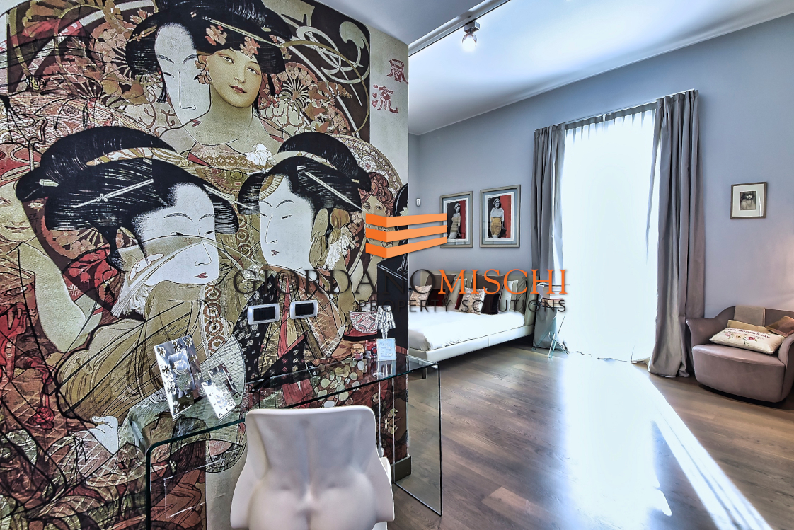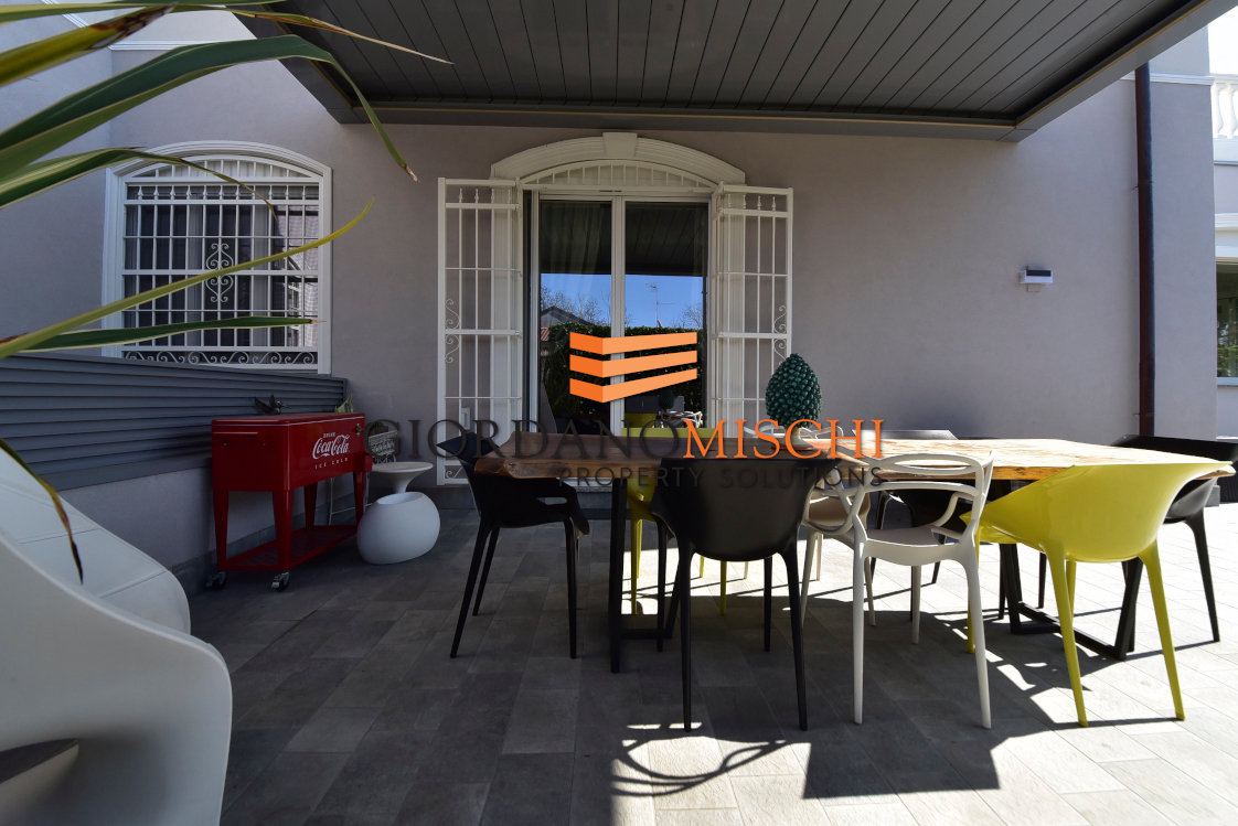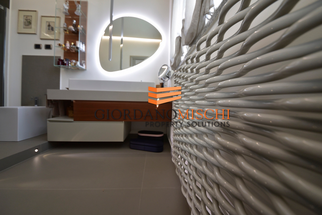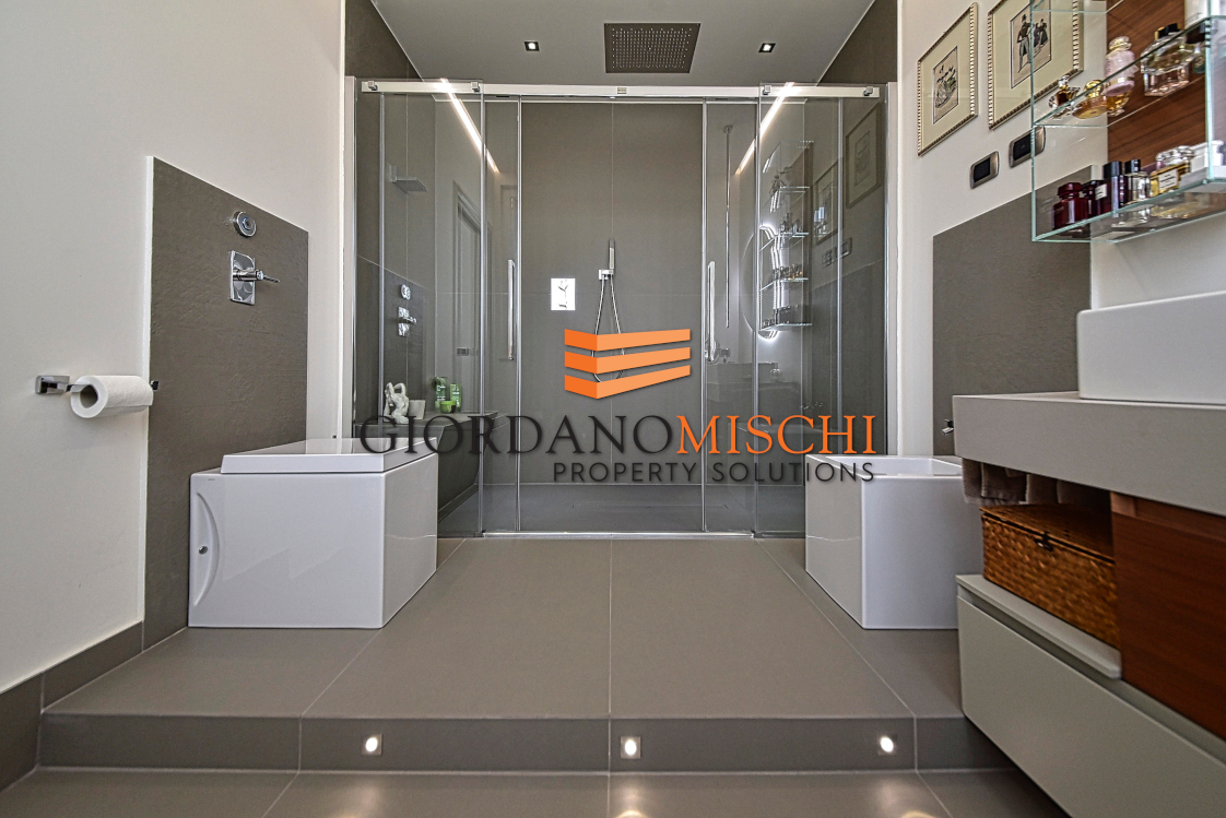 Una comoda scala conduce al piano superiore, dove la villa esprime il suo carattere più intimo. La camera padronale, con soffitti a 350 centimetri, è un ambiente di assoluto respiro: dotata di cabina armadio, bagno en-suite privato, si apre su un ampio terrazzo soleggiato che diventa naturale prolungamento dello spazio vitale nei mesi caldi. Una seconda camera matrimoniale dispone di una raffinata cabina armadio — dettaglio che rivela l’attenzione al quotidiano che ha guidato il progetto di ristrutturazione. Una terza camera completa l’offerta del piano, accompagnata da un ulteriore bagno di servizio. Due servizi totali garantiscono praticità assoluta per la famiglia.