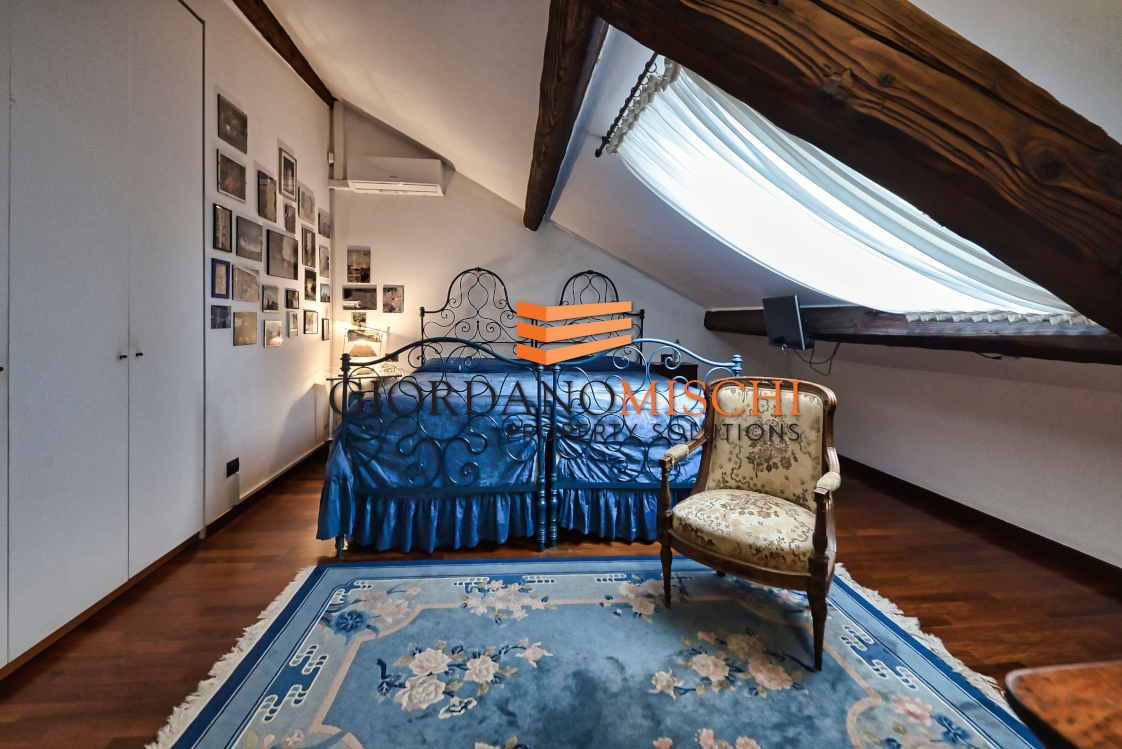 Tornando al soggiorno si accede tramite una scala dritta, posta accanto alla parete sud, al piano superiore mansardato, raggiungibile anche tramite un secondo ingresso con accesso dalle scale esterne. Il piano mansardato si apre con una zona living con caminetto e una zona notte così composta: una camera matrimoniale con accesso al bagno privato finestrato e dotato di vasca e una seconda camera singola con ulteriore bagno finestrato con box doccia.