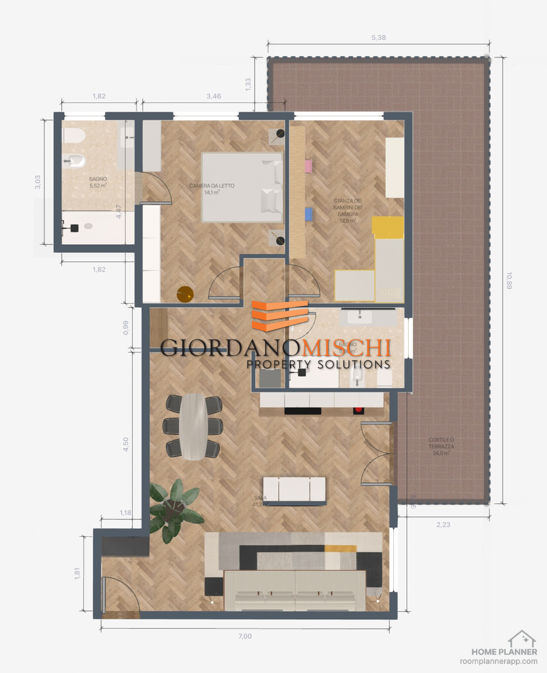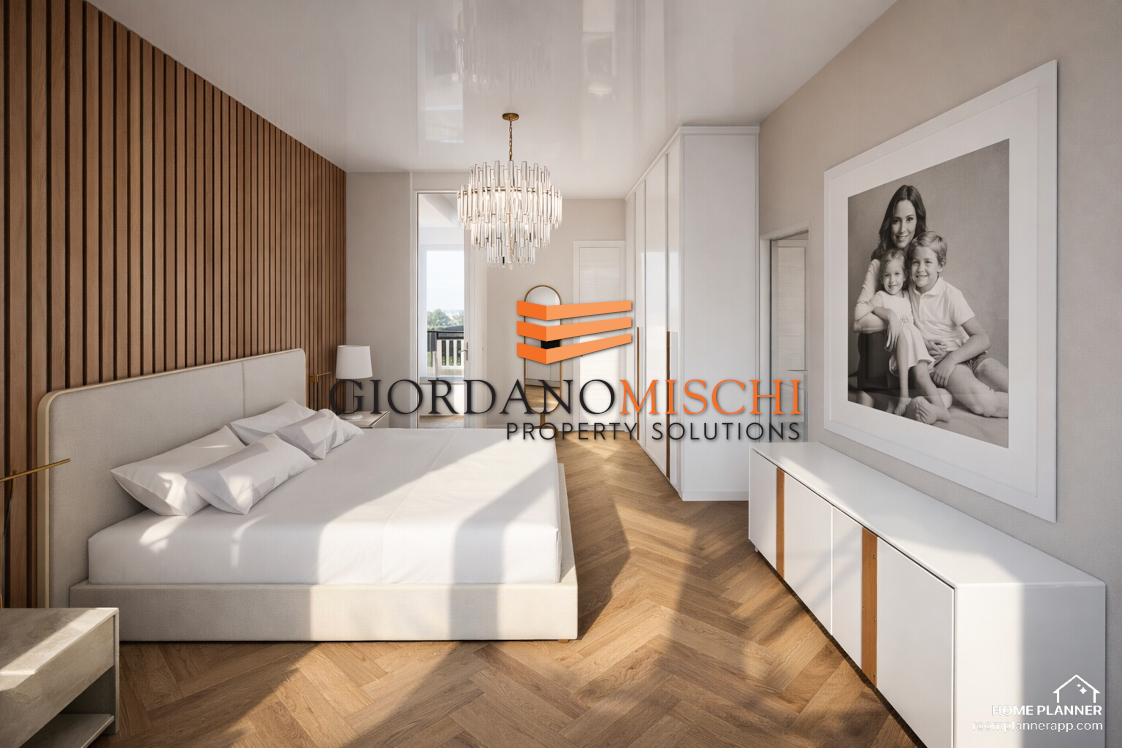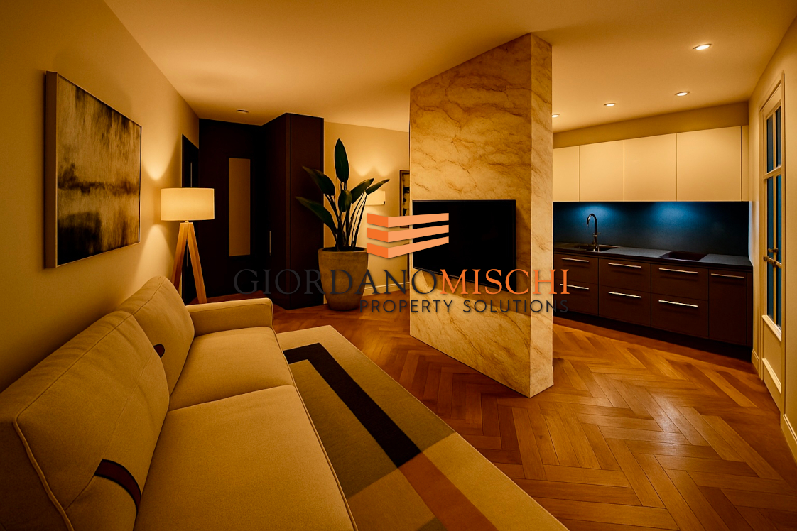 L’ingresso ci accompagna in una moderna ed elegante zona living con cucina abitabile separata da una raffinata parete d’accento e area pranzo, uno spazio conviviale e contemporaneo con accesso diretto all’ampia balconata, ideale per momenti di relax e per ricevere ospiti.