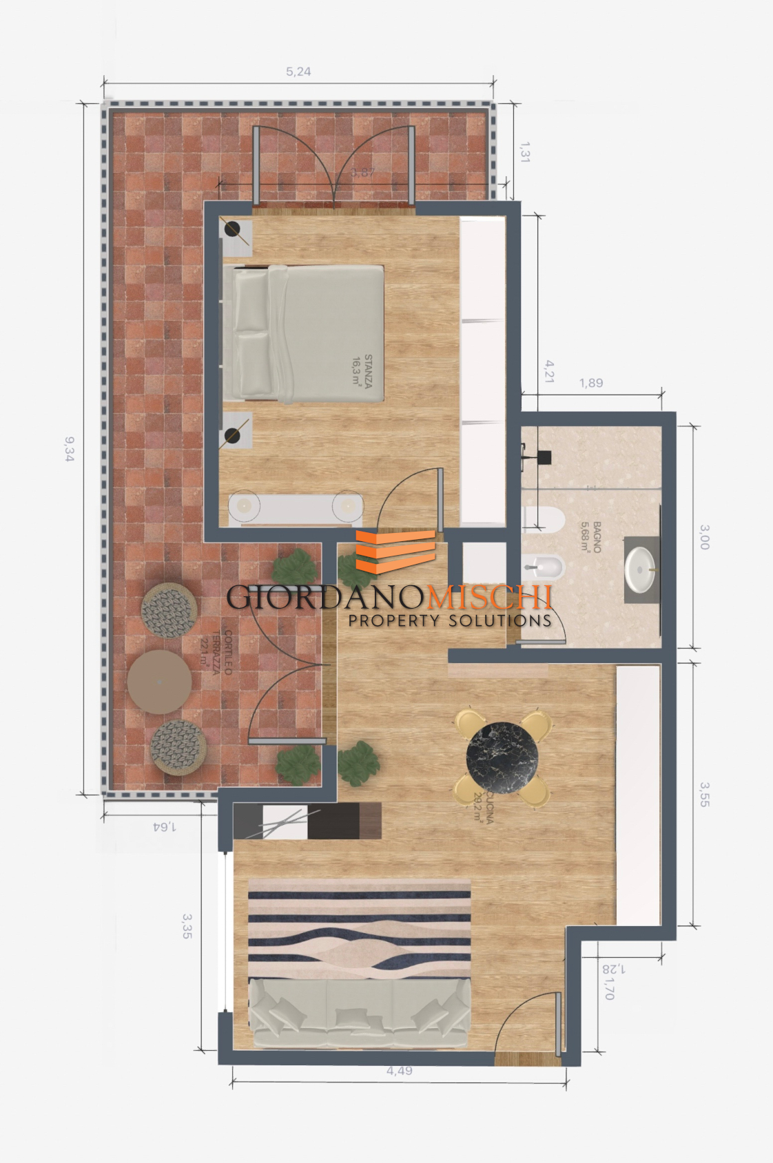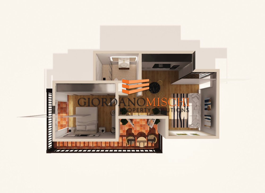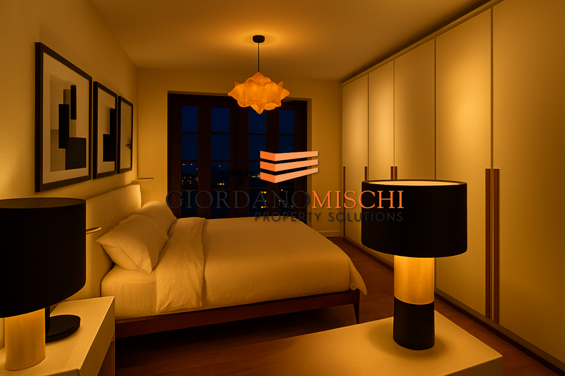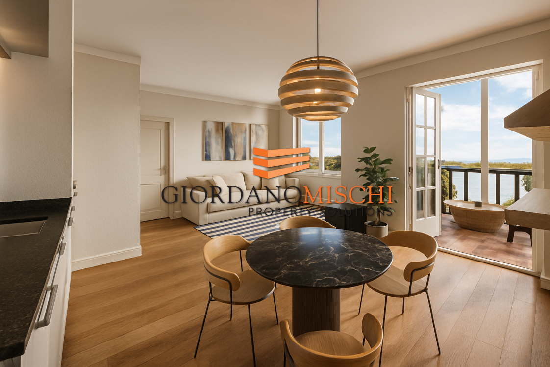 L’ingresso conduce a una moderna ed elegante zona living, dove la cucina a vista e l’area pranzo si fondono in uno spazio conviviale e contemporaneo. Il cuore della zona giorno è la grande balconata, una vera estensione all’aperto ideale per momenti di relax e convivialità.