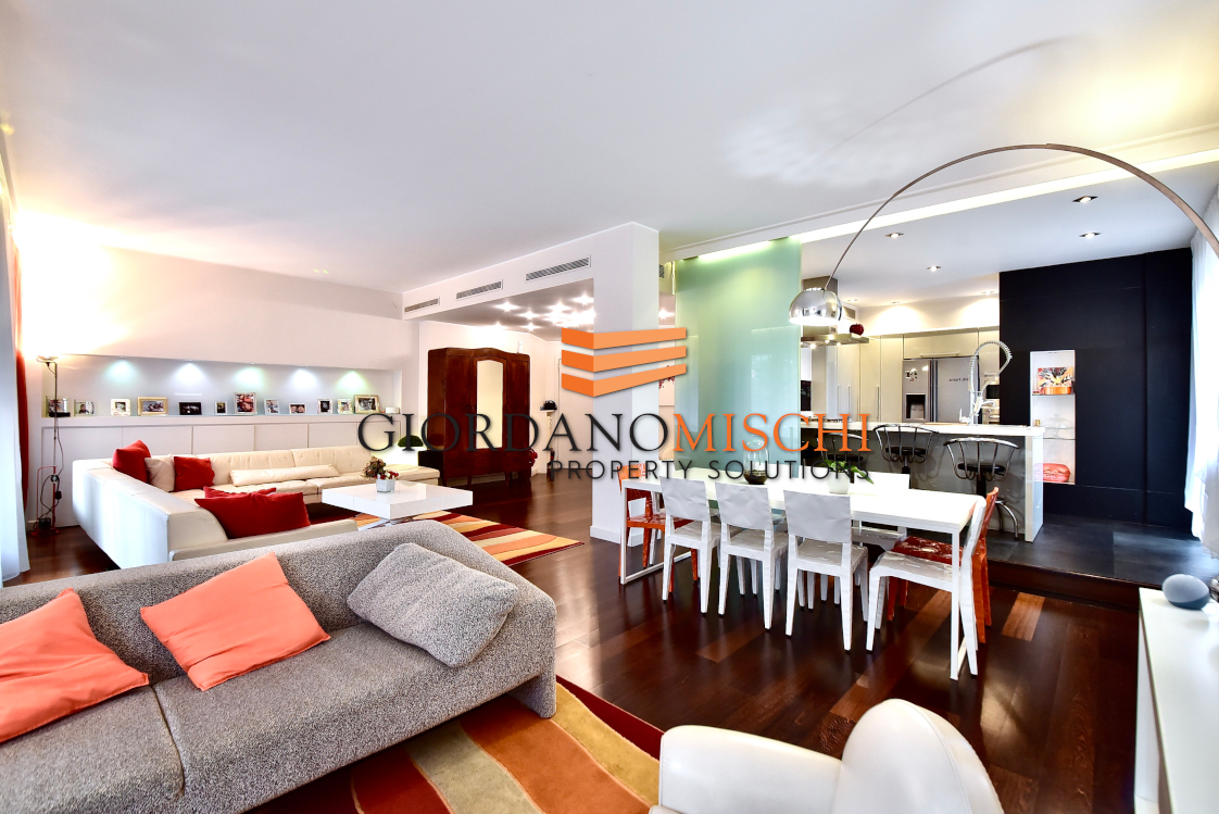 A caratterizzare i diversi ambienti dando idea di confort, profondità e coerenza al visone complessiva vi sono l’elevata luminosità dell’intero appartamento, le pareti bianche rasate, il ribassamento dei soffitti attrezzato con faretti e il parquet di pregiata essenza scura.