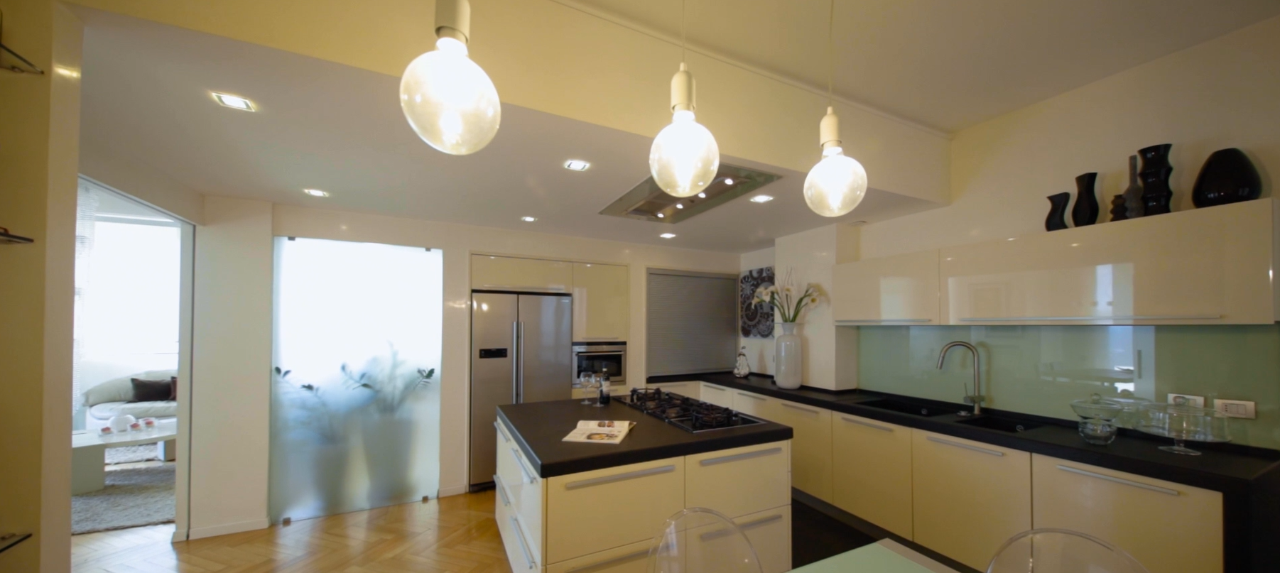 La cucina rappresenta, invece, il perfetto connubio tra funzionalità e stile contemporaneo. Essa è caratterizzata da un’isola centrale ed è sapientemente separata dal living da un’elegante porta scorrevole in vetro satinato. Allo stesso livello si trovano inoltre due spaziose camere da letto, di cui una servita da un ampio bagno dotato di vasca e doccia.