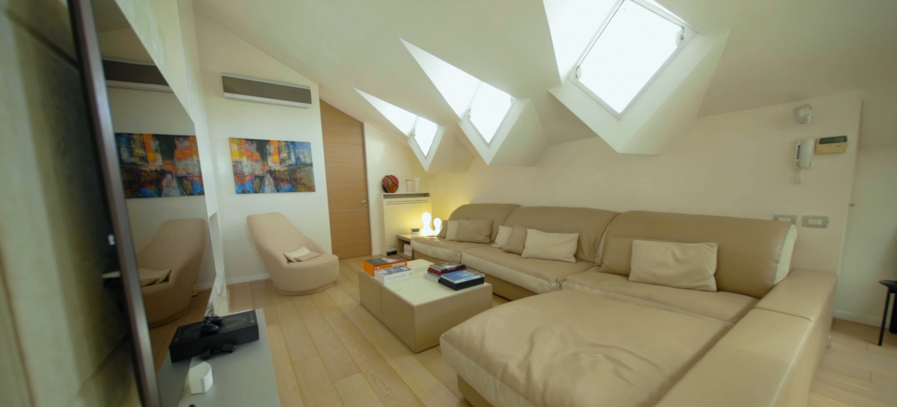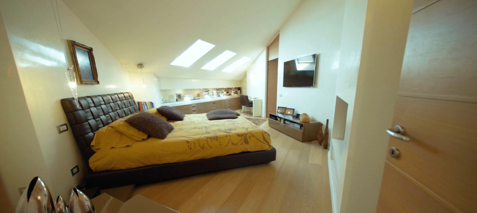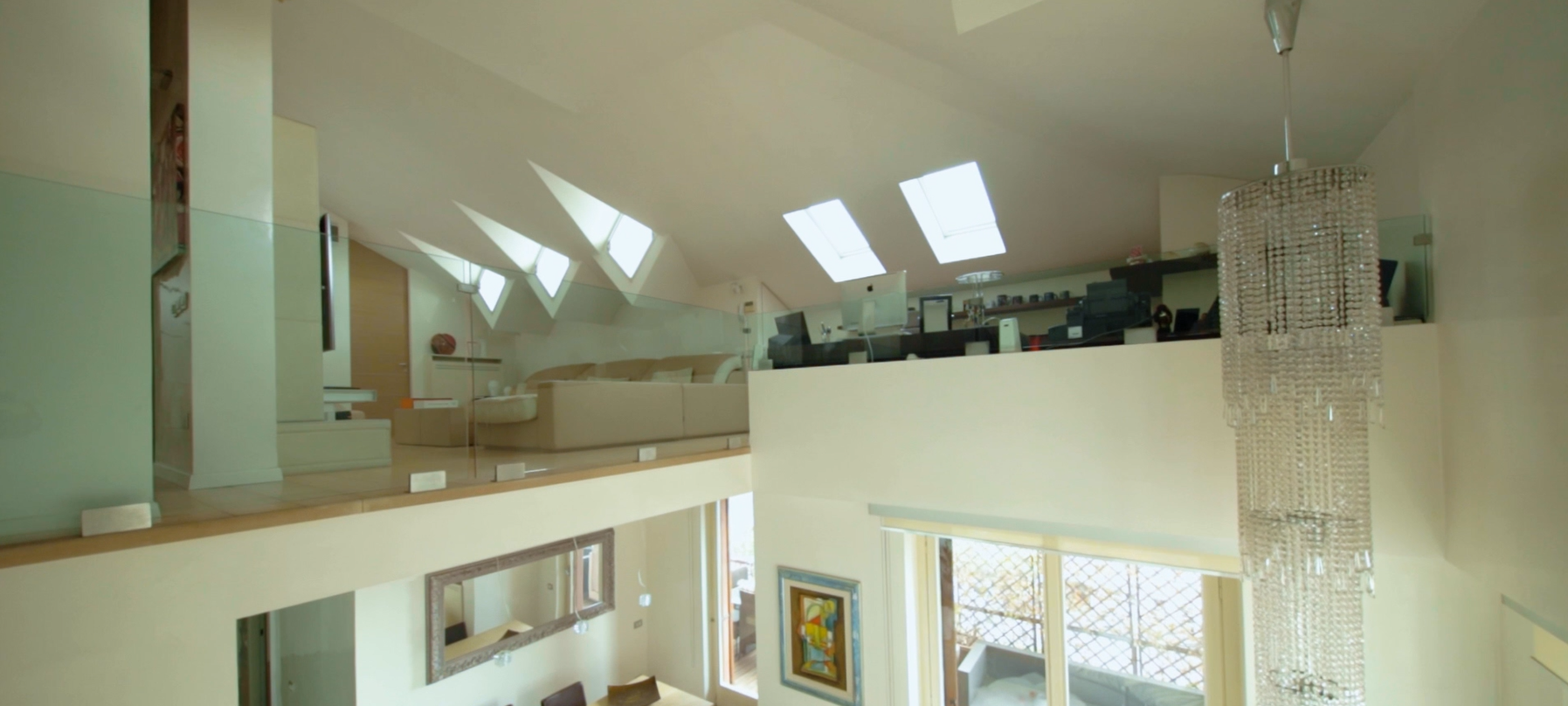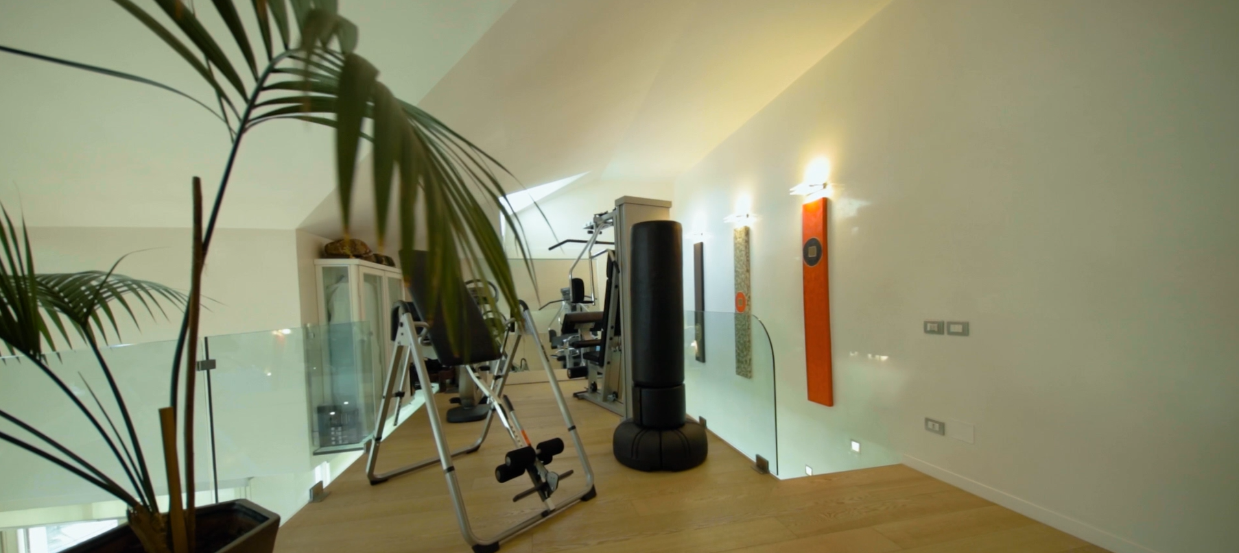 Il piano superiore è accessibile attraverso una moderna scala in vetro. Qui, il soppalco si apre su un ufficio luminoso e un’area fitness privata, offrendo un comodo affaccio sulla zona giorno sottostante. La zona notte di questo livello ospita la suite padronale, concepita come un vero rifugio per il benessere personale, grazie all’accesso diretto a un bagno dotato di grande vasca idromassaggio e a una zona doccia con seduta ergonomica e finiture in mosaico, una vera e propria spa privata d’eccellenza.