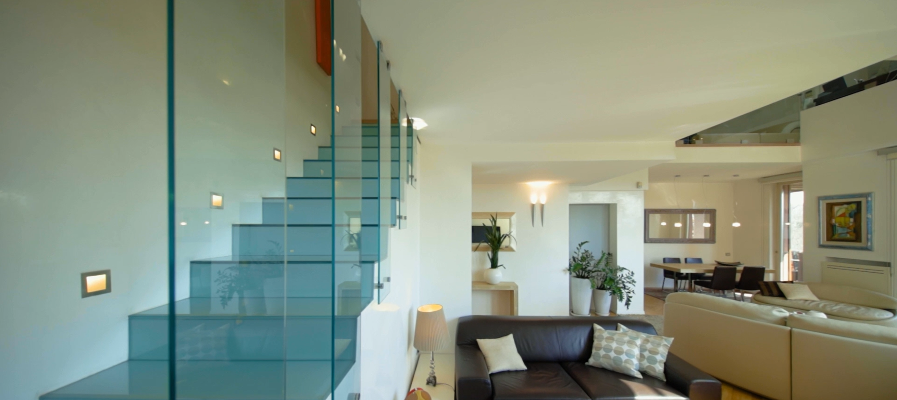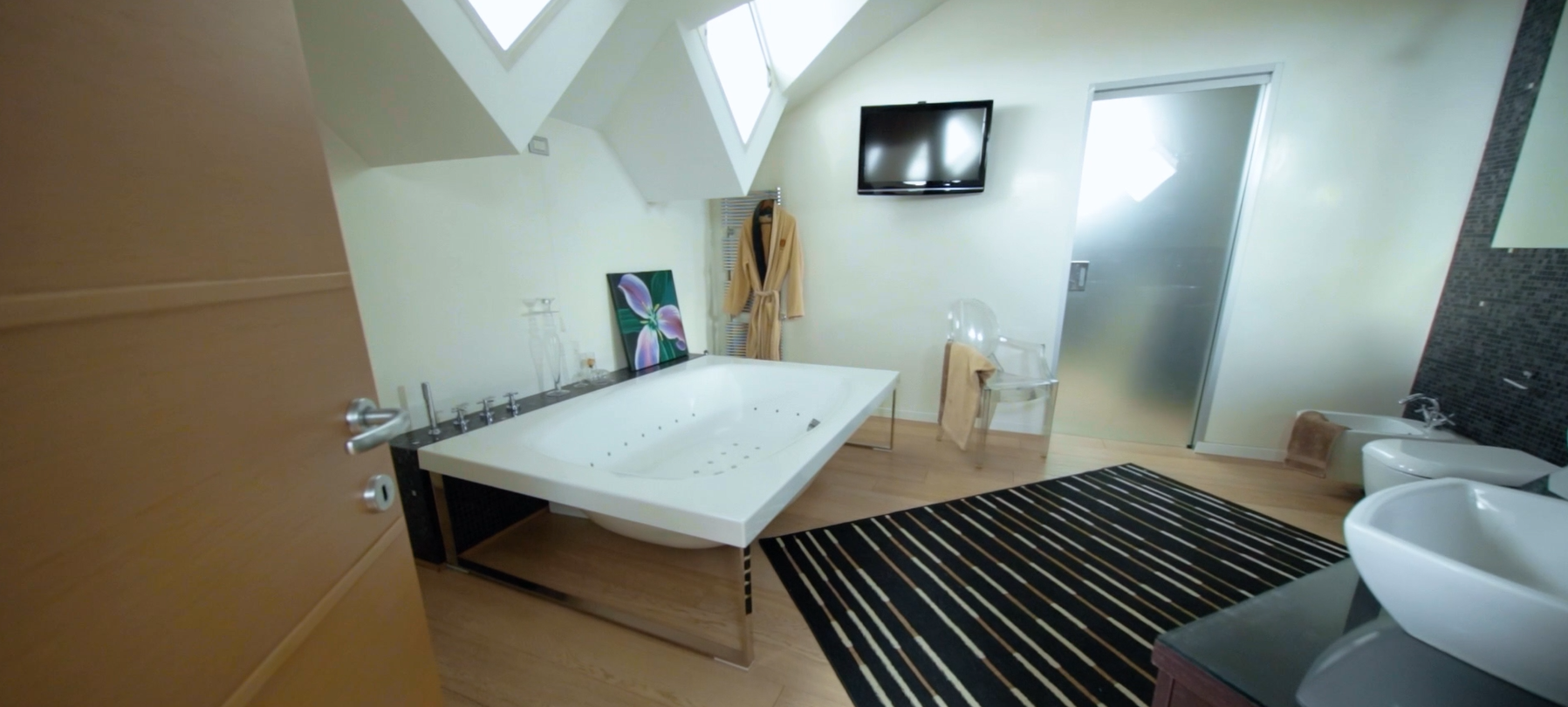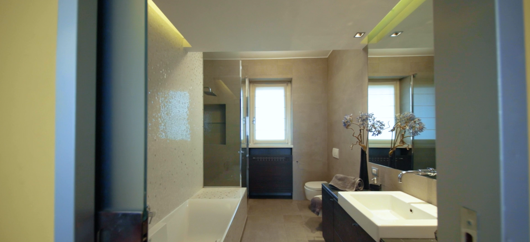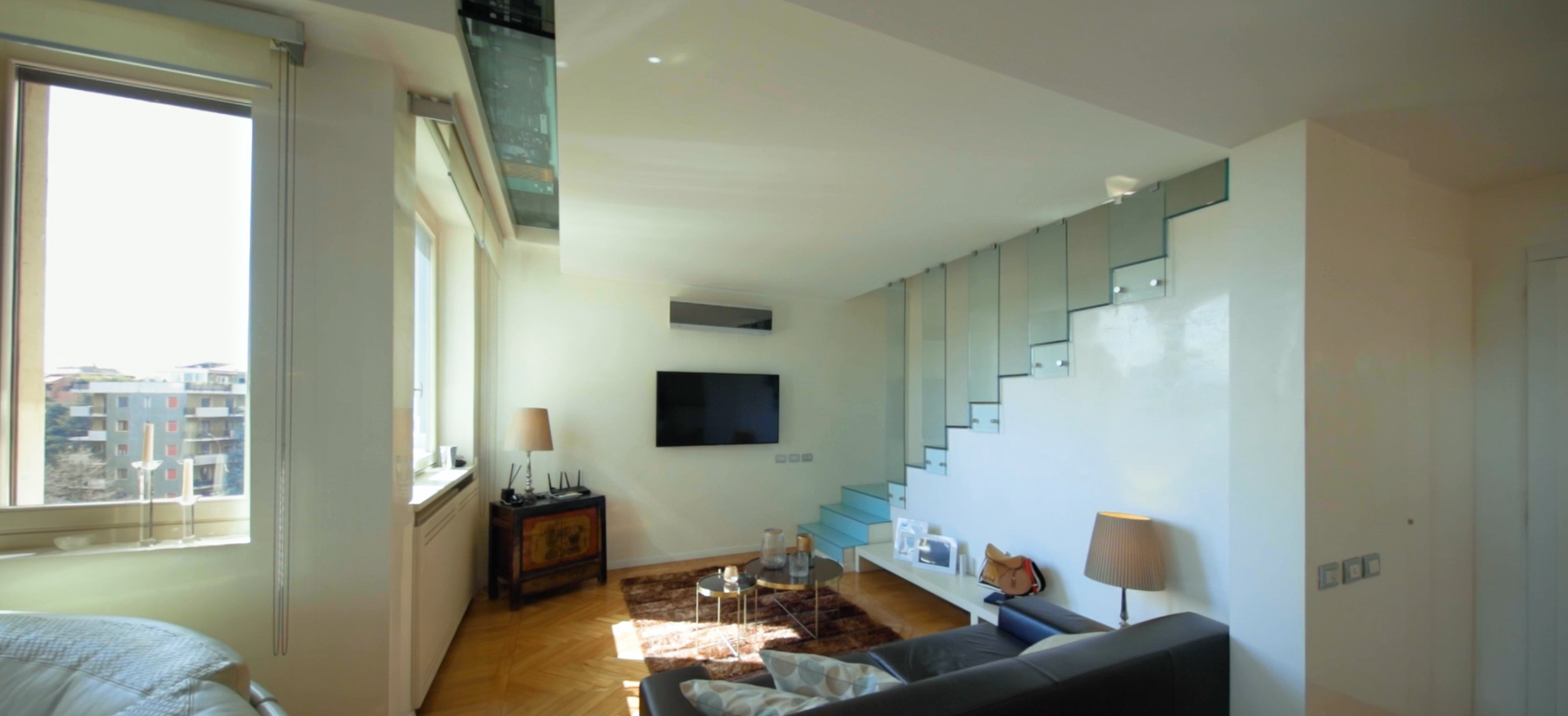 Il piano superiore è accessibile attraverso una moderna scala in vetro. Qui, il soppalco si apre su un ufficio luminoso e un’area fitness privata, offrendo un comodo affaccio sulla zona giorno sottostante. La zona notte di questo livello ospita la suite padronale, concepita come un vero rifugio per il benessere personale, grazie all’accesso diretto a un bagno dotato di grande vasca idromassaggio e a una zona doccia con seduta ergonomica e finiture in mosaico, una vera e propria spa privata d’eccellenza.