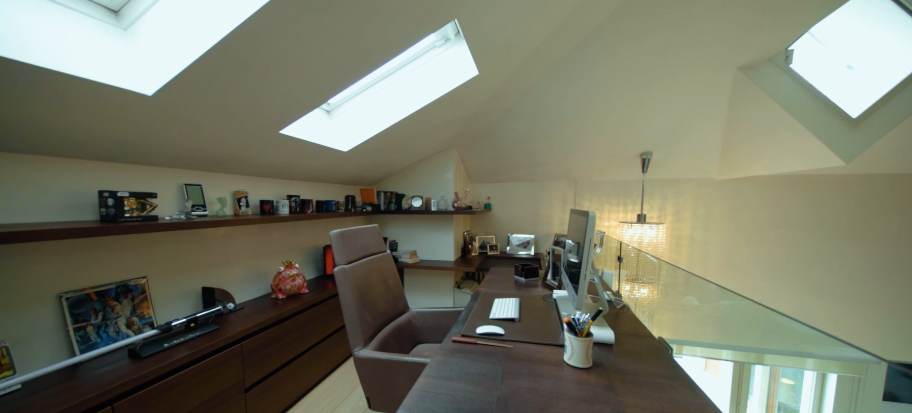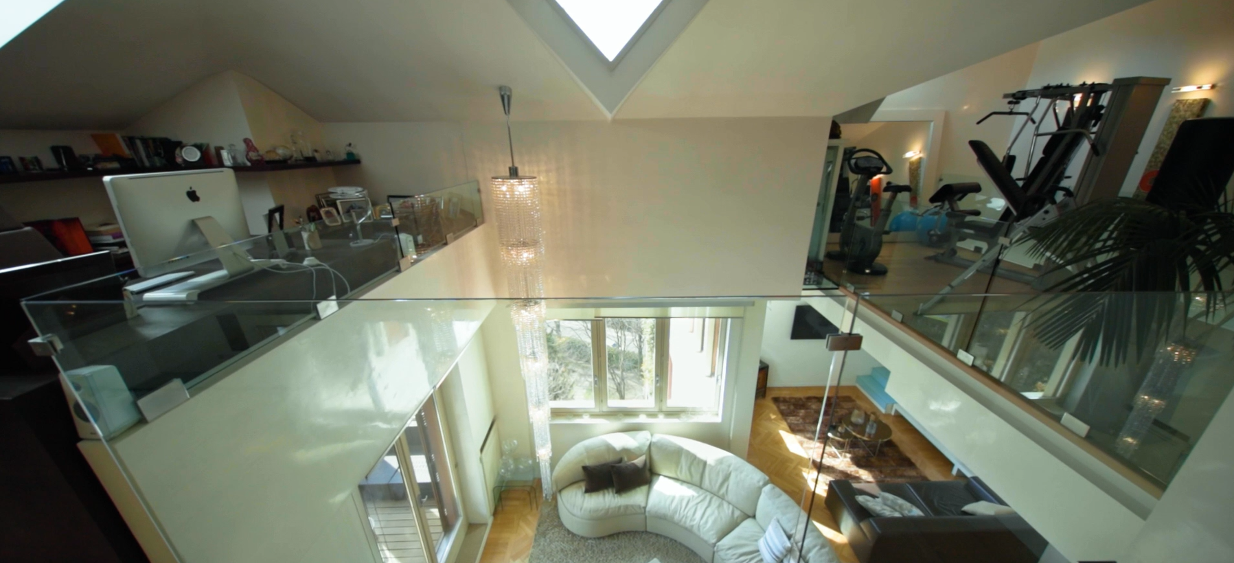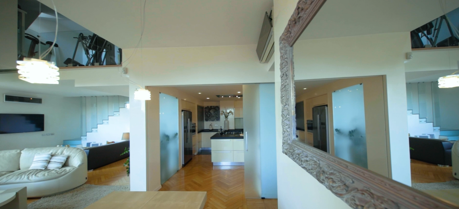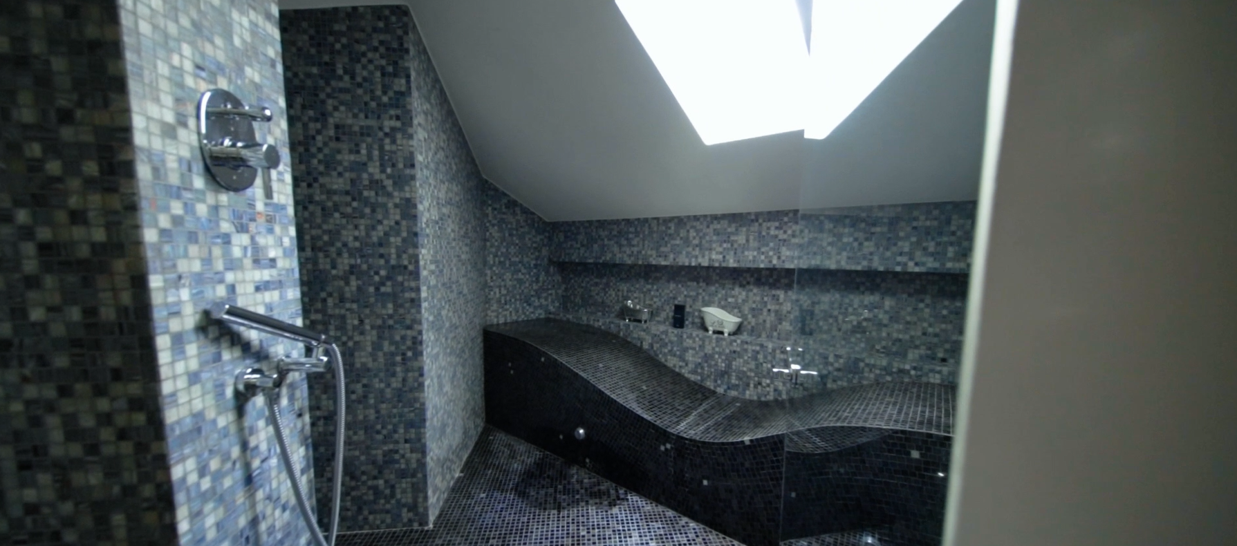 Il piano superiore è accessibile attraverso una moderna scala in vetro. Qui, il soppalco si apre su un ufficio luminoso e un’area fitness privata, offrendo un comodo affaccio sulla zona giorno sottostante. La zona notte di questo livello ospita la suite padronale, concepita come un vero rifugio per il benessere personale, grazie all’accesso diretto a un bagno dotato di grande vasca idromassaggio e a una zona doccia con seduta ergonomica e finiture in mosaico, una vera e propria spa privata d’eccellenza.